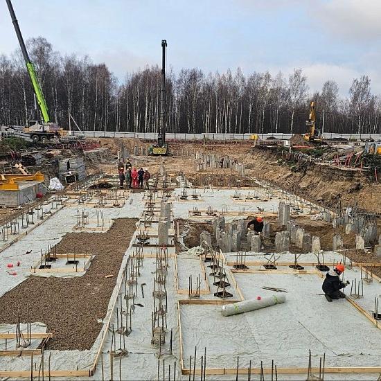 На площадке забили более половины свай, подготовили фундамент для крана и ведут работы в котловане — объект возводится по графику.