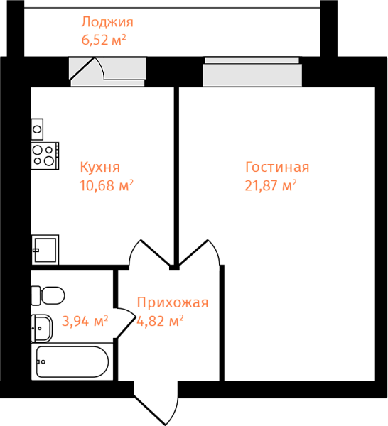 1-комнатная, 44.57м²
