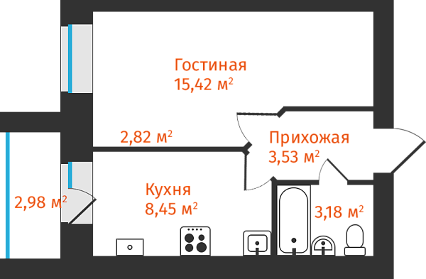 Новая 1-комнатная квартира в ЖК Норские резиденции на 1 этаже площадью 32.07 м² в 1 подъезде номер 3