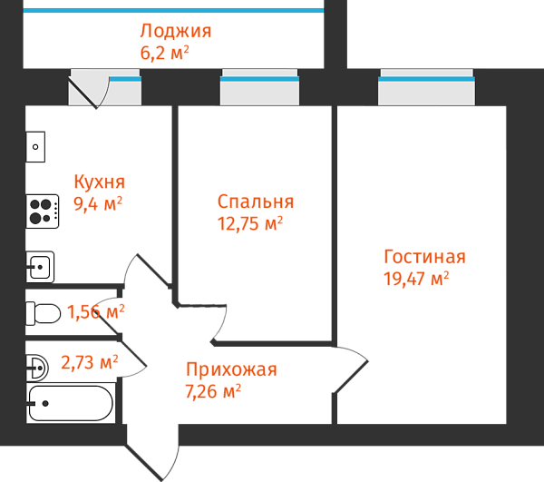 Новая 2-комнатная квартира в ЖК Норские резиденции на 5 этаже площадью 56.27 м² в 4 подъезде номер 79