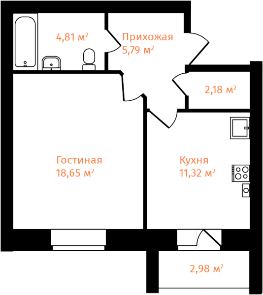 1-комнатная, 44.24м²