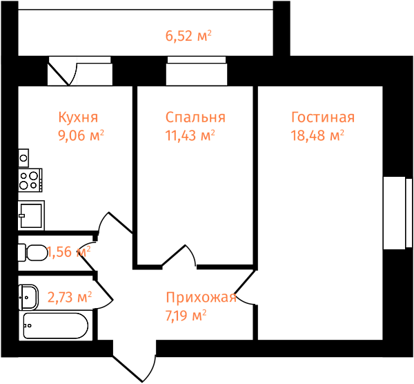 Новая 2-комнатная квартира в ЖК Норские резиденции на 2 этаже площадью 53.71 м² в 4 подъезде номер 50
