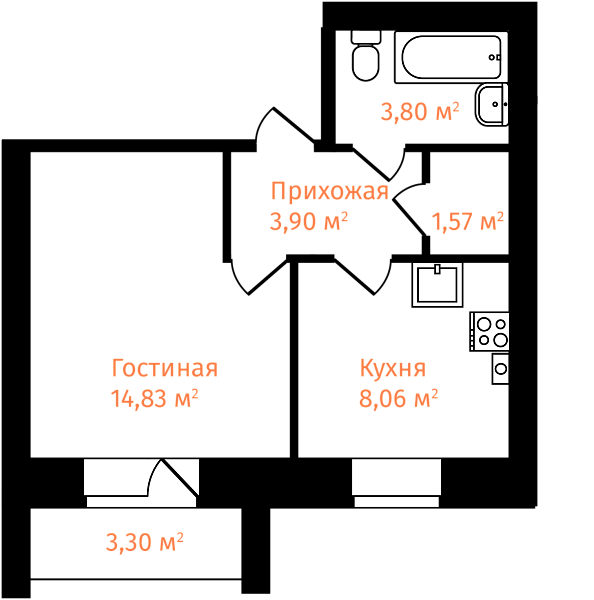 Новая 1-комнатная квартира в ЖК Норские резиденции на 3 этаже площадью 33.81 м² в 3 подъезде номер 39