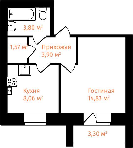 Новая 1-комнатная квартира в ЖК Норские резиденции на 4 этаже площадью 33.81 м² в 2 подъезде номер 25