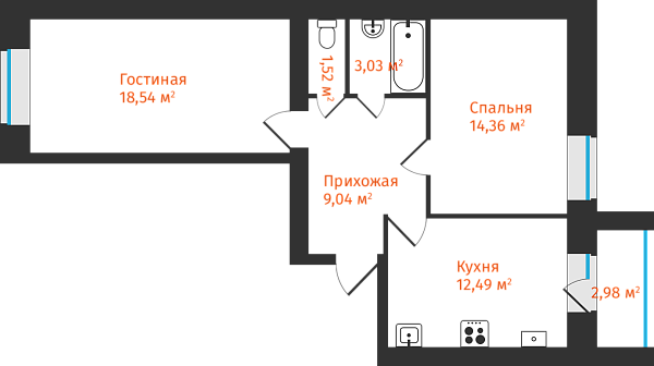 Новая 2-комнатная квартира в ЖК Норские резиденции на 3 этаже площадью 60.47 м² в 1 подъезде номер 12