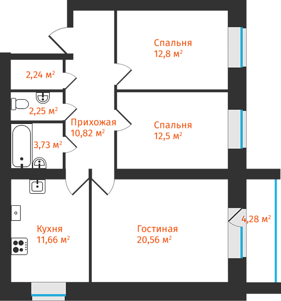 3-комнатная, 78.34м²
