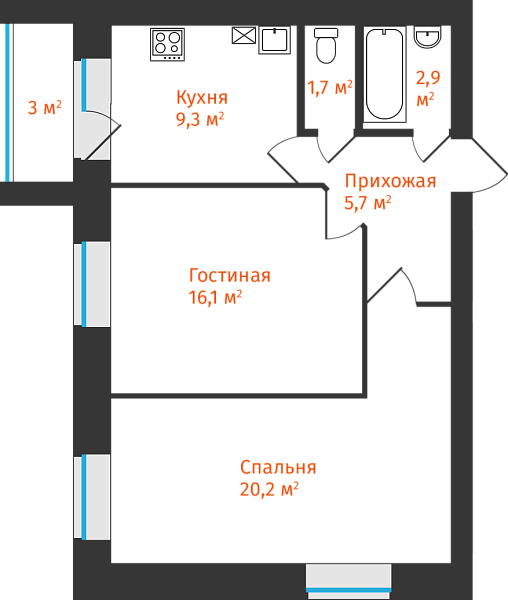 Новая 2-комнатная квартира в ЖК Норские резиденции на 3 этаже площадью 57.52 м² в 1 подъезде номер 10
