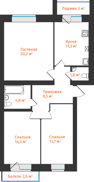 Новая 3-комнатная квартира в ЖК Норские резиденции на 1 этаже площадью 79.78 м² в 2 подъезде номер 17
