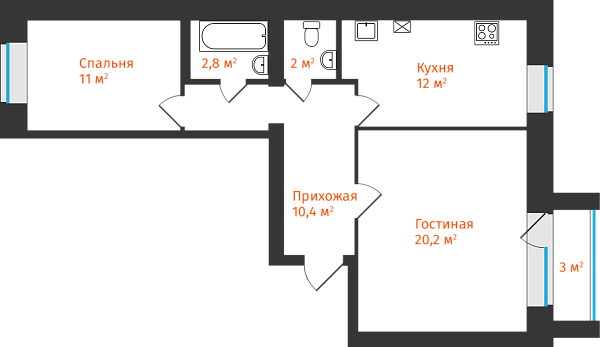Новая 2-комнатная квартира в ЖК Норские резиденции на 3 этаже площадью 59.95 м² в 1 подъезде номер 12