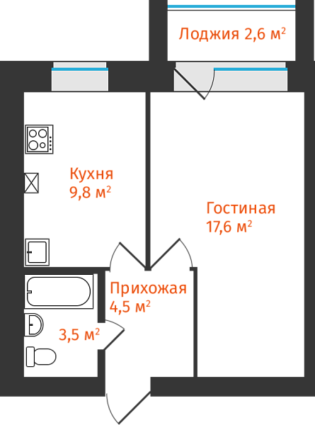 1-комнатная, 36.87м²