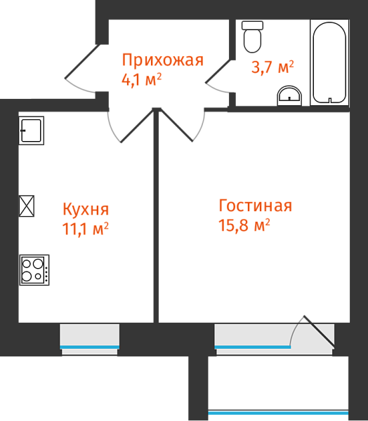Новая 1-комнатная квартира в ЖК Норские резиденции на 4 этаже площадью 36.30 м² в 2 подъезде номер 32