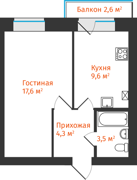 Новая 1-комнатная квартира в ЖК Норские резиденции на 4 этаже площадью 35.82 м² в 1 подъезде номер 14