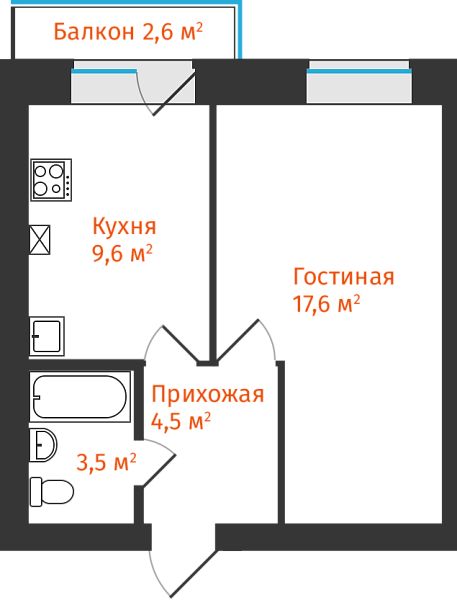 Новая 1-комнатная квартира в ЖК Норские резиденции на 2 этаже площадью 35.82 м² в 1 подъезде номер 7