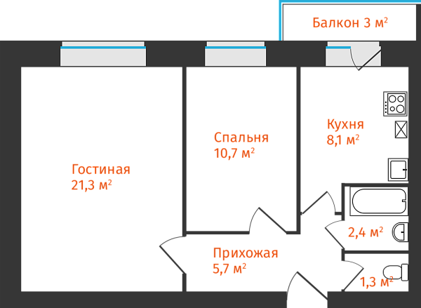 Новая 2-комнатная квартира в ЖК Норские резиденции на 2 этаже площадью 50.28 м² в 2 подъезде номер 23