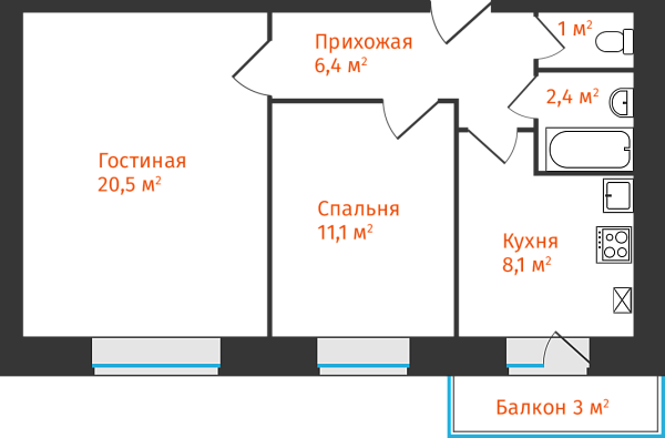 2-комнатная, 50.71м²