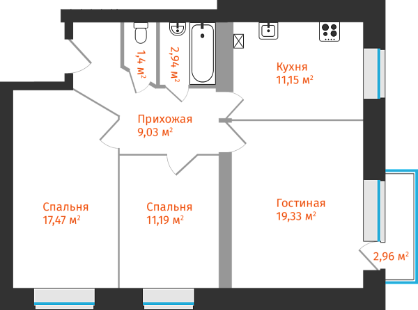 3-комнатная, 73.41м²