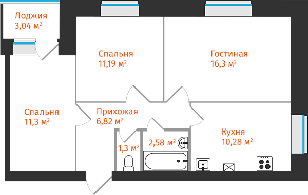3-комнатная, 61.29м²