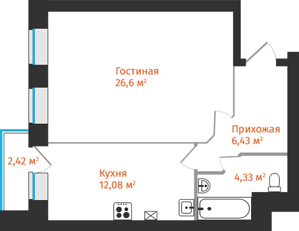 Новая 1-комнатная квартира в ЖК Норские резиденции на 3 этаже площадью 50.65 м² в 2 подъезде номер 19