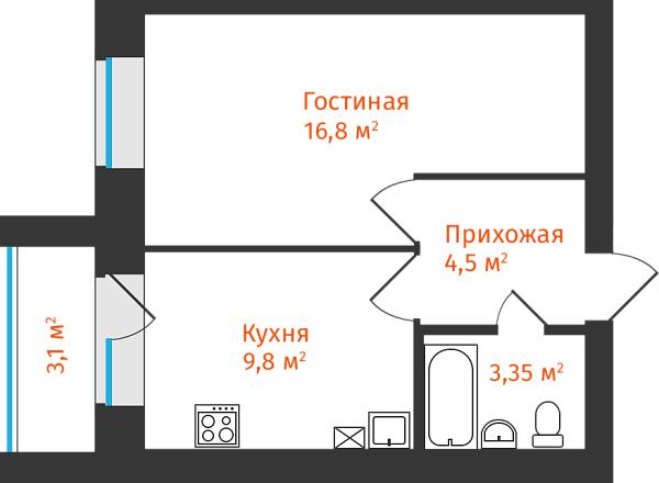 Новая 1-комнатная квартира в ЖК Норские резиденции на 4 этаже площадью 35.86 м² в 1 подъезде номер 15