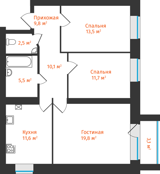 Новая 3-комнатная квартира в ЖК Норские резиденции на 4 этаже площадью 76.28 м² в 4 подъезде номер 64
