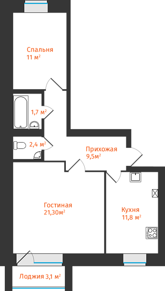 Новая 2-комнатная квартира в ЖК Норские резиденции на 2 этаже площадью 59.40 м² в 2 подъезде номер 21