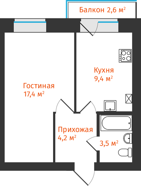 Новая 1-комнатная квартира в ЖК Норские резиденции на 2 этаже площадью 35.13 м² в 2 подъезде номер 22