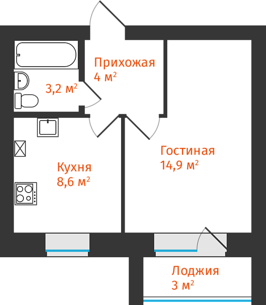 Новая 1-комнатная квартира в ЖК Норские резиденции на 4 этаже площадью 32.33 м² в 1 подъезде номер 20