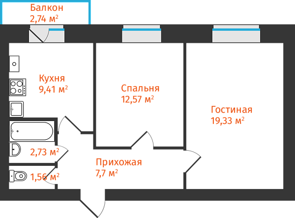 Новая 2-комнатная квартира в ЖК Норские резиденции на 4 этаже площадью 54.12 м² в 1 подъезде номер 19
