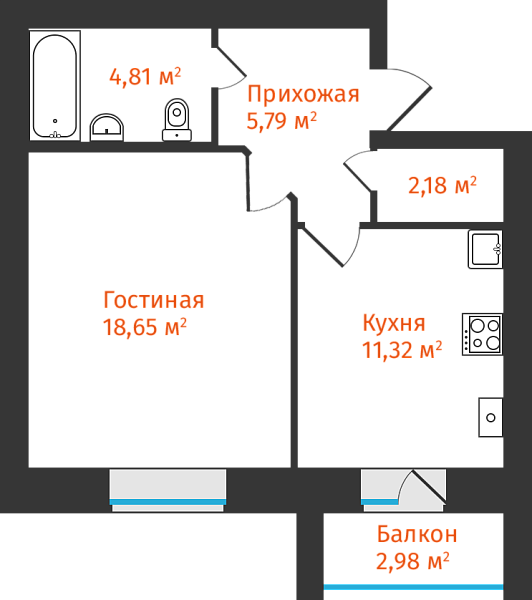 Новая 1-комнатная квартира в ЖК Норские резиденции на 5 этаже площадью 44.24 м² в 2 подъезде номер 42