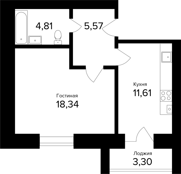 Новая 1-комнатная квартира в ЖК Норские резиденции на 1 этаже площадью 41.98 м² в 1 подъезде номер 1
