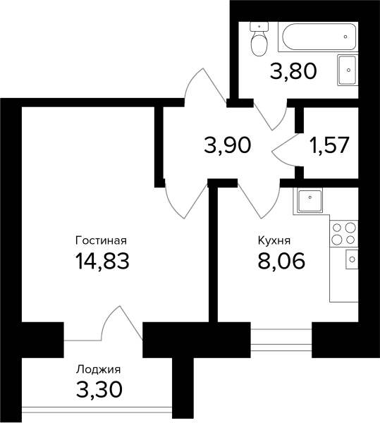 Новая 1-комнатная квартира в ЖК Норские резиденции на 3 этаже площадью 33.81 м² в 3 подъезде номер 39